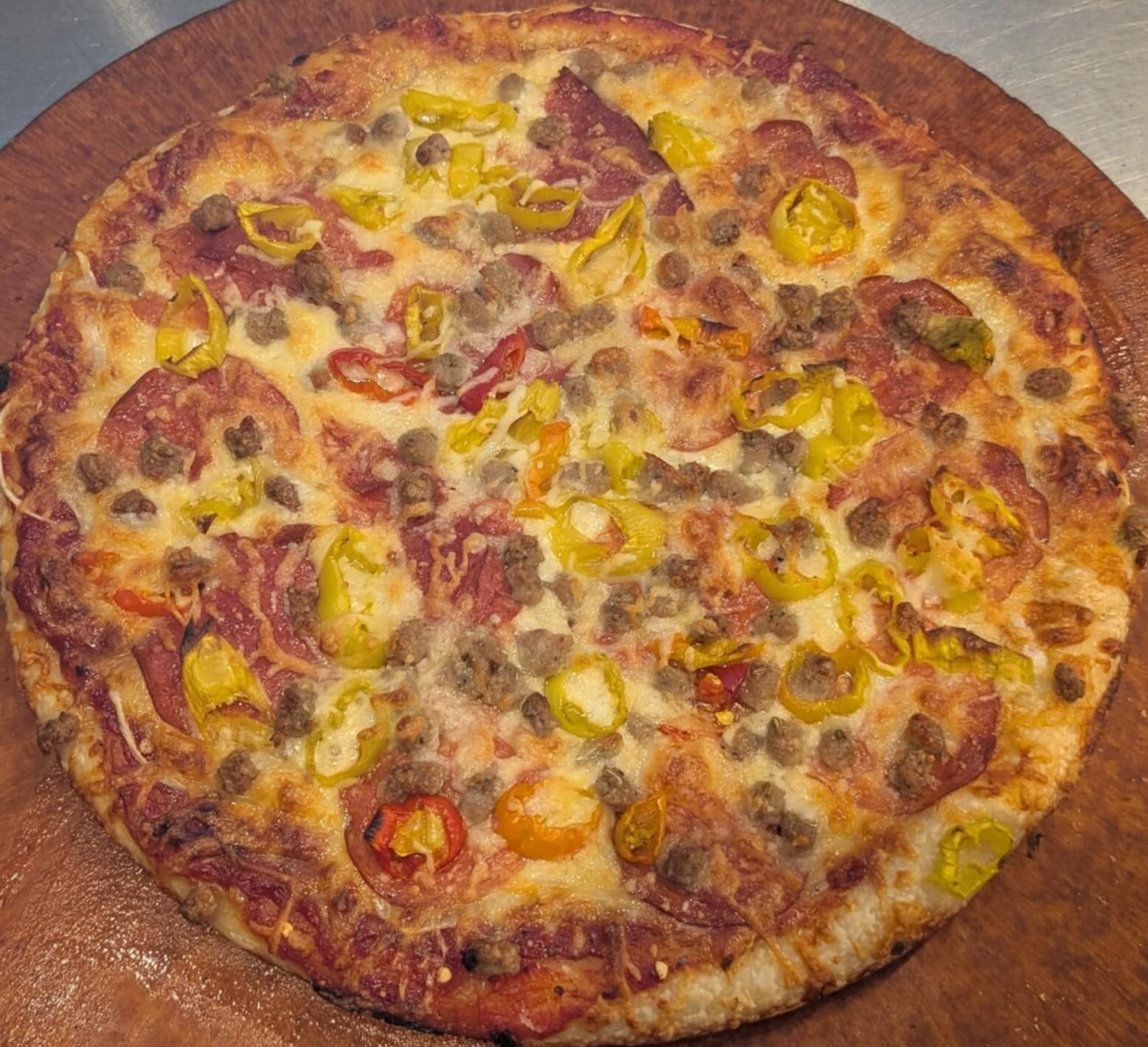 Chili Flakes, Onions, Pepperoni, Banana Peppers, Italian Sausage.