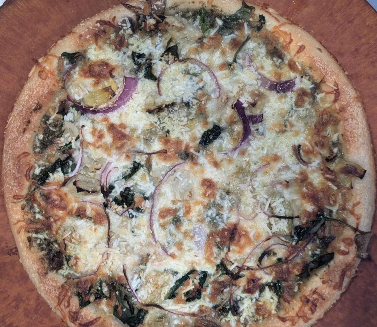 PESTO SAUCE, GARLIC, CHICKEN, MUSHROOMS, RED ONIONS, PINEAPPLE.