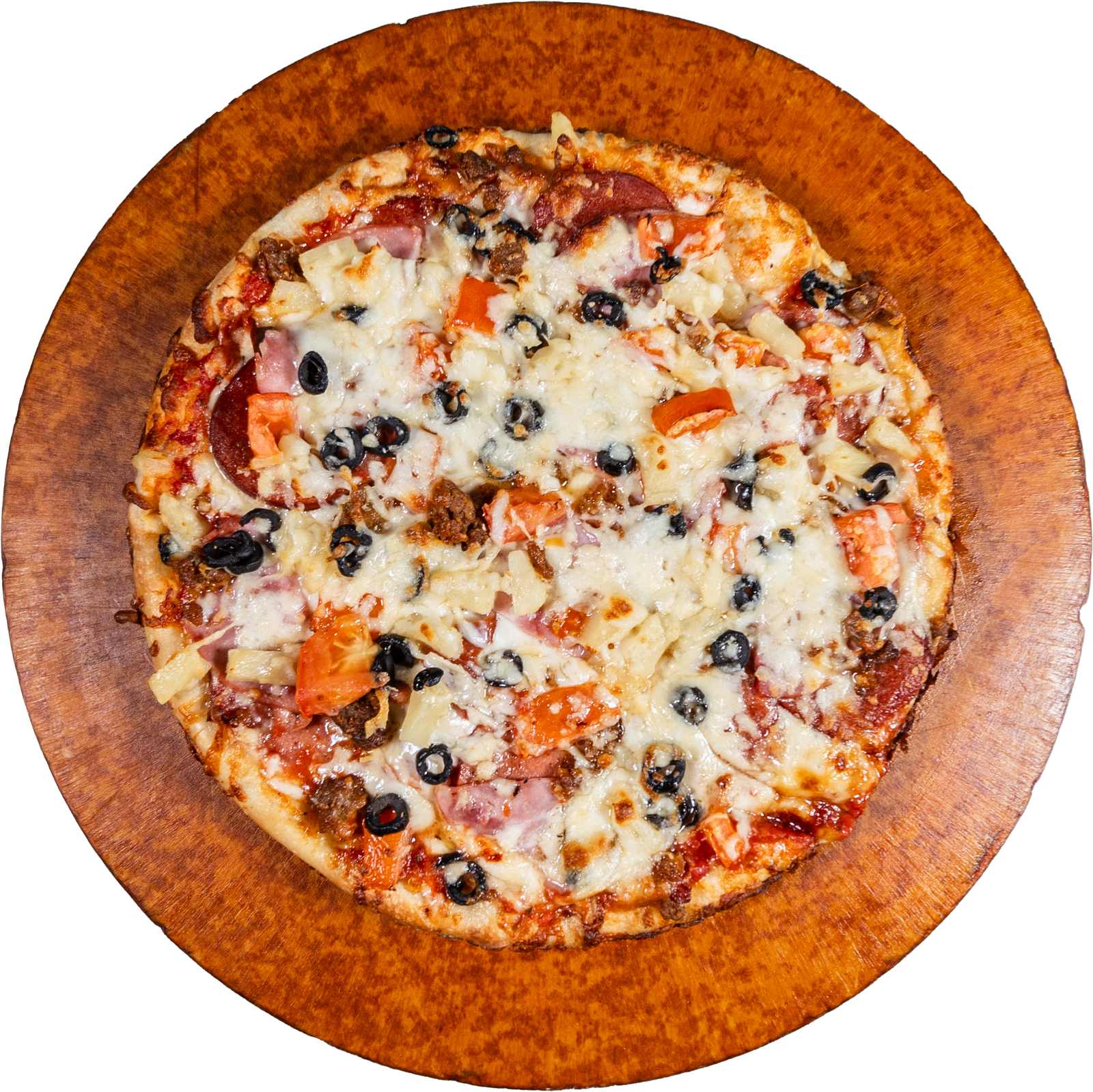 HAM, PEPPERONI, CAPICOLA, CHORIZO SAUSAGE, PINEAPPLE, TOMATOES, BLACK OLIVES